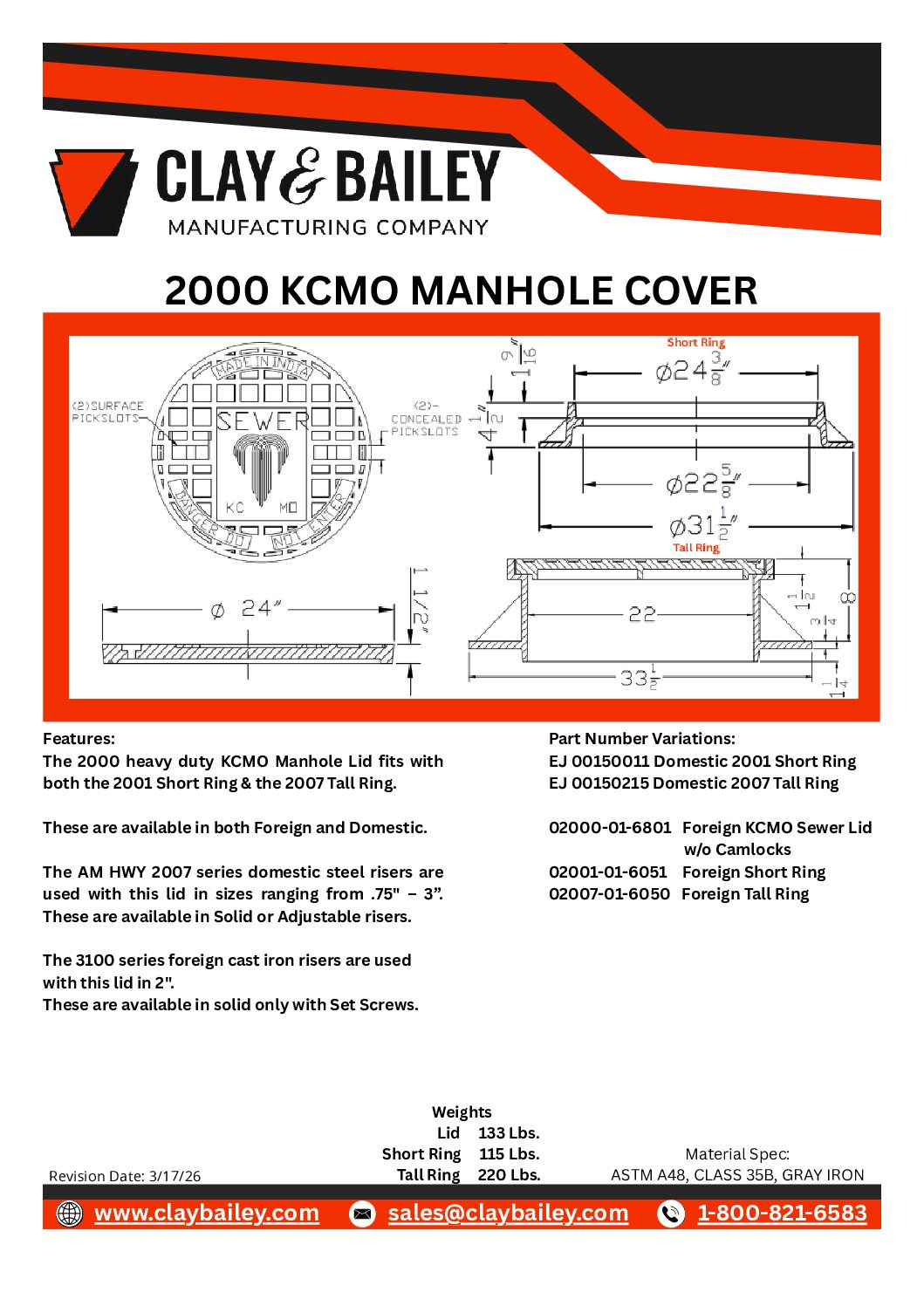 The 2000 heavy duty KCMO Manhole Lid fits with both the 2001 Short Ring & the 2007 Tall Ring.