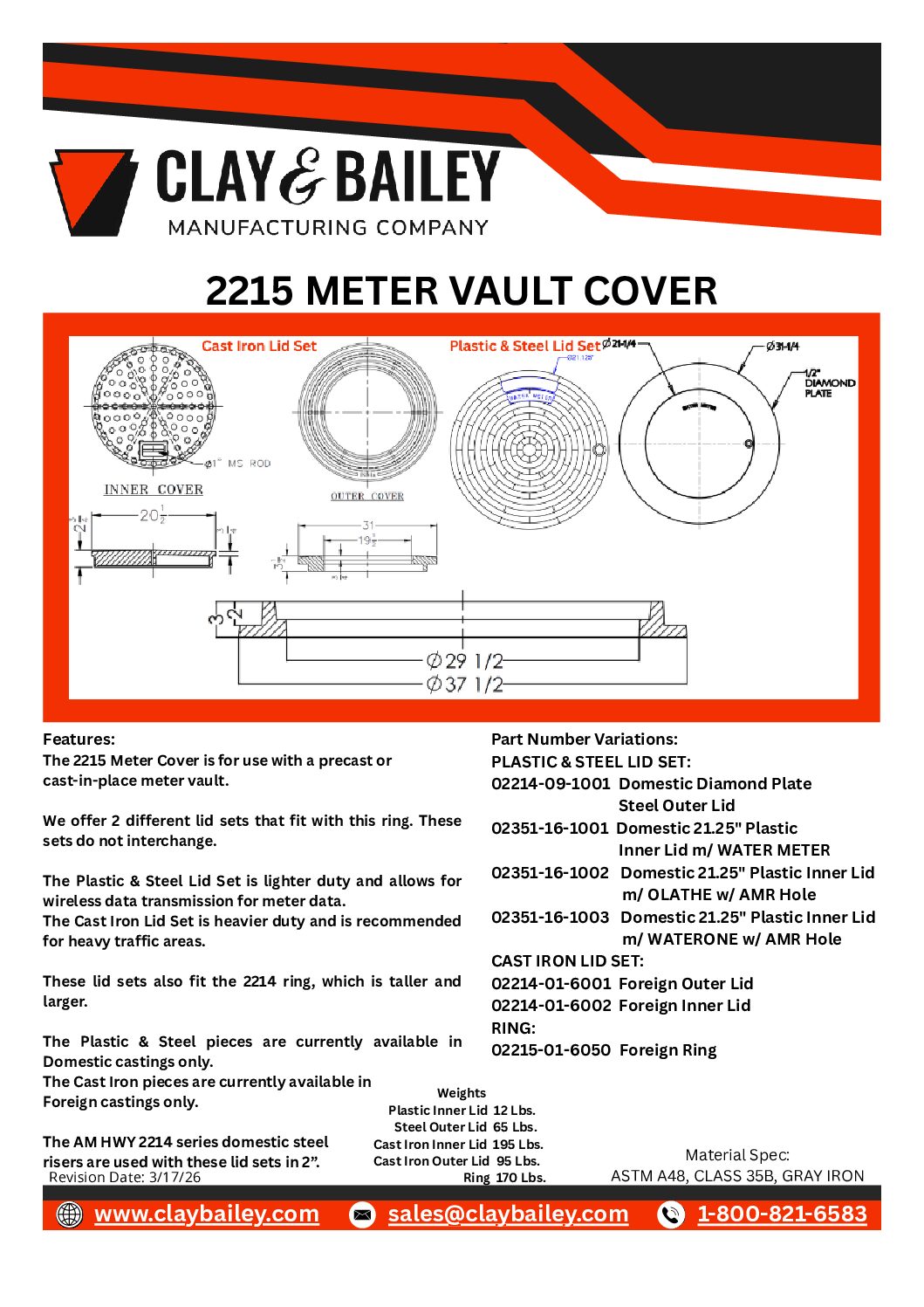 The 2215 Meter Cover is for use with a precast or cast-in-place meter vault.