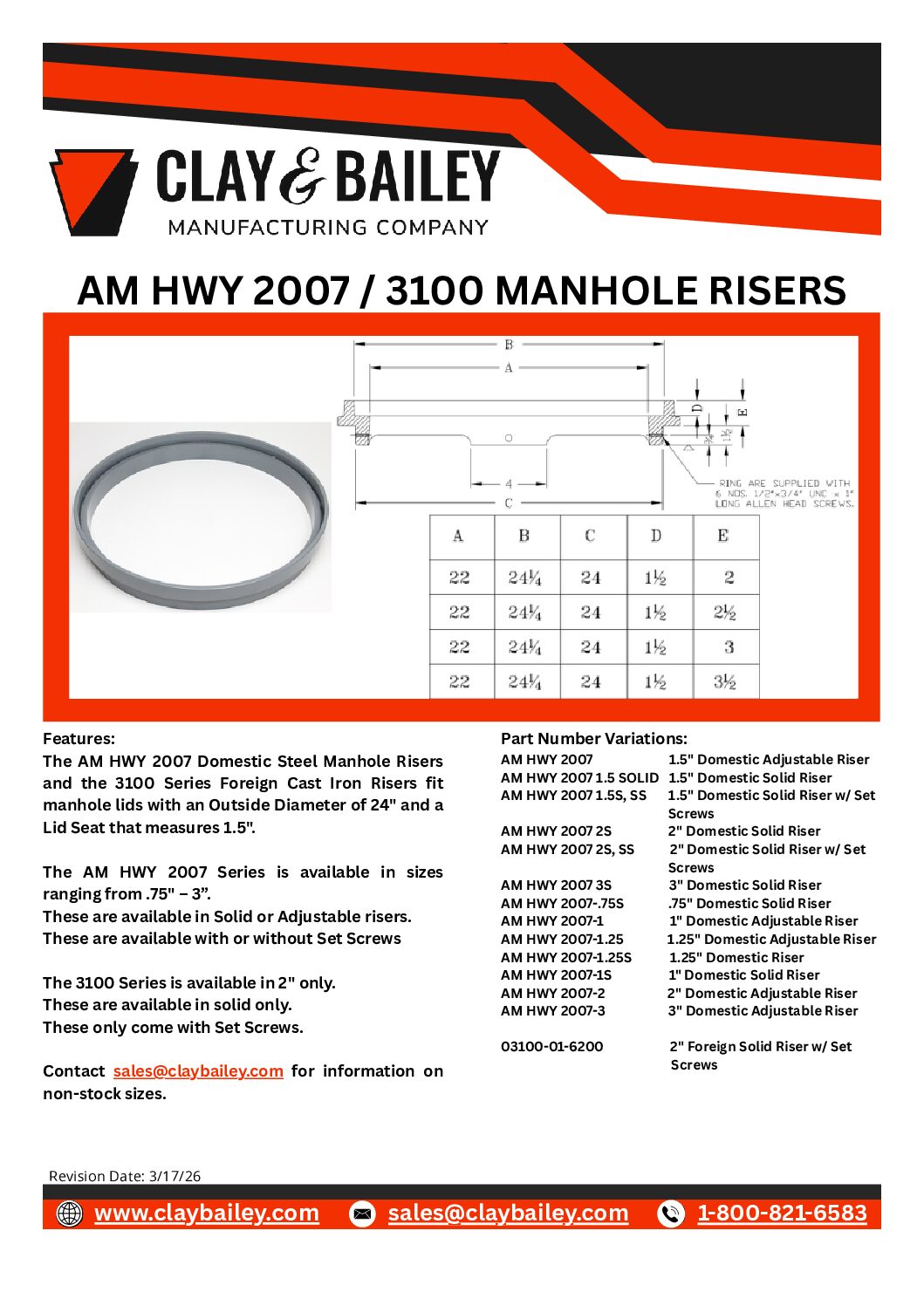 The AM HWY 2007 Domestic Steel Manhole Risers and the 3100 Series Foreign Cast Iron Risers fit manhole lids with an Outside Diameter of 24″ and a Lid Seat that measures 1.5″.